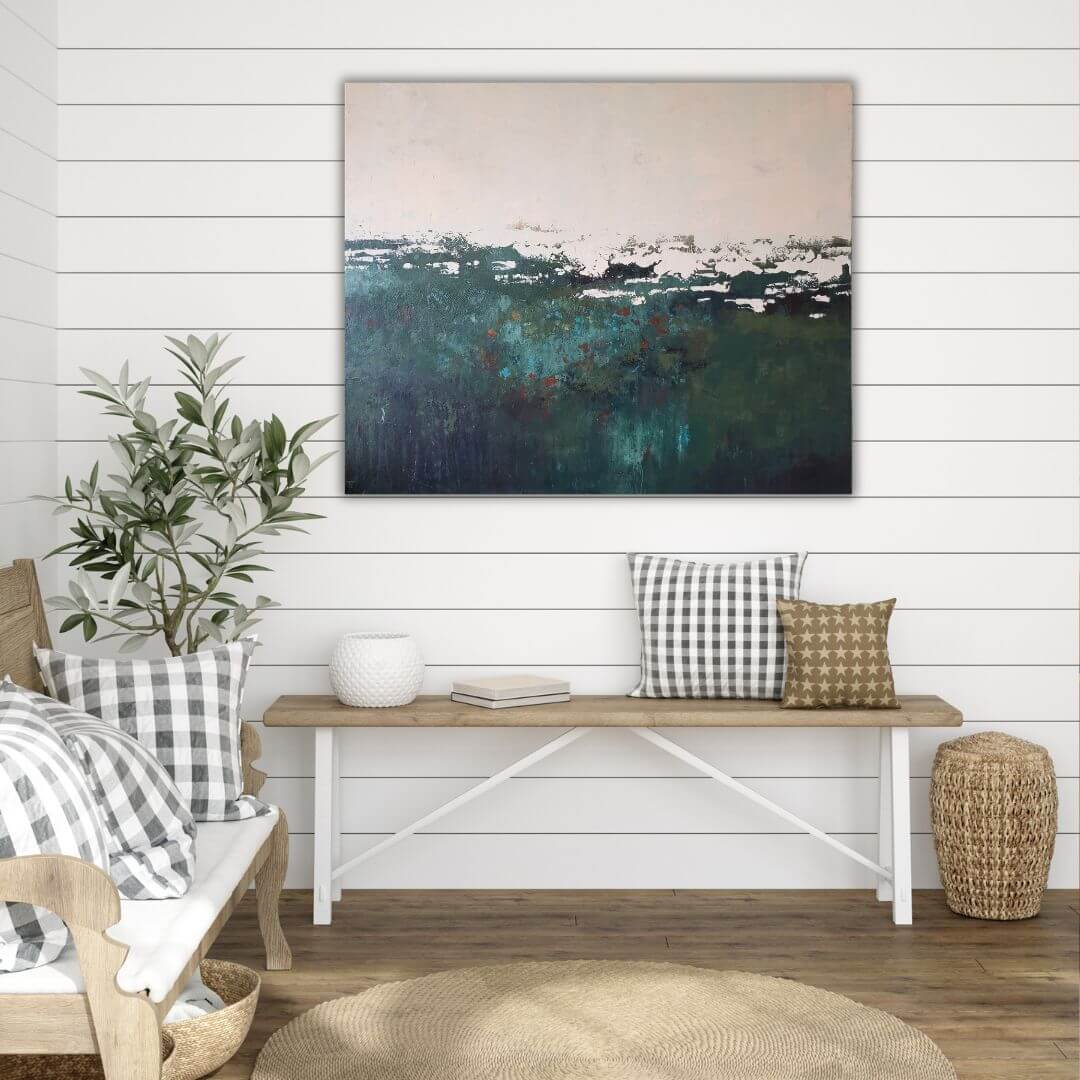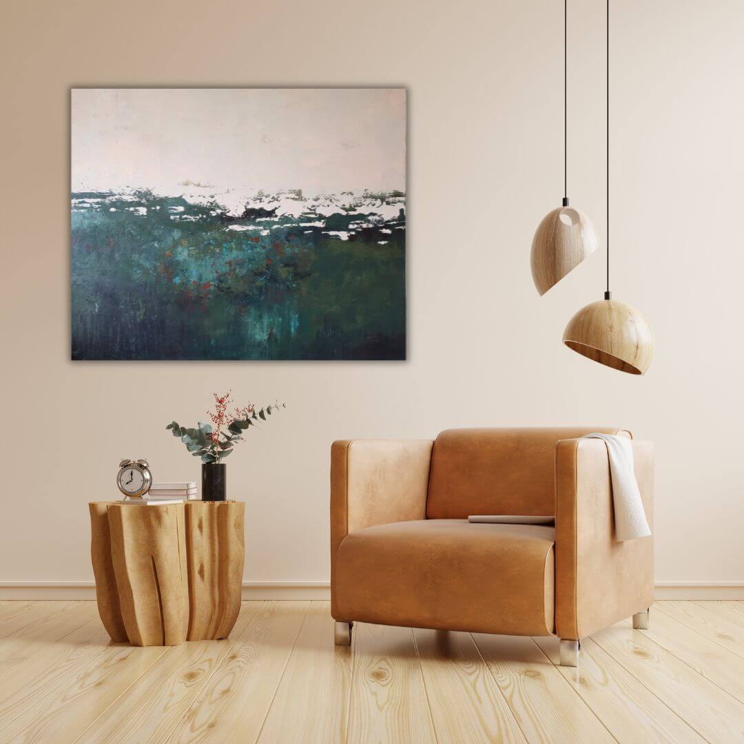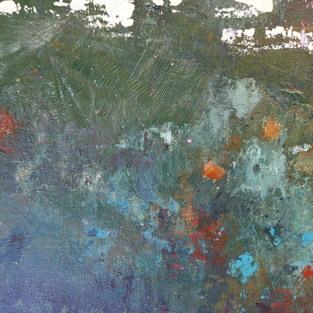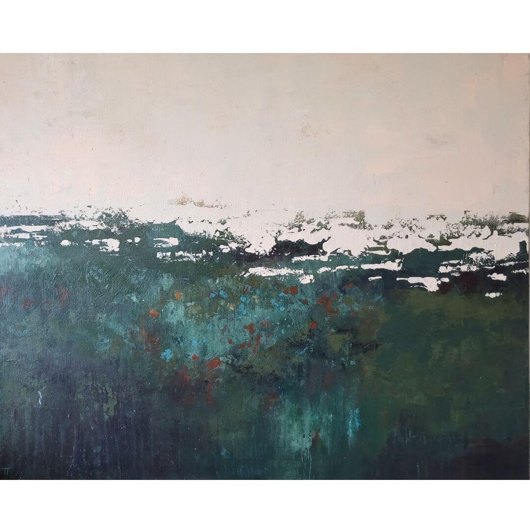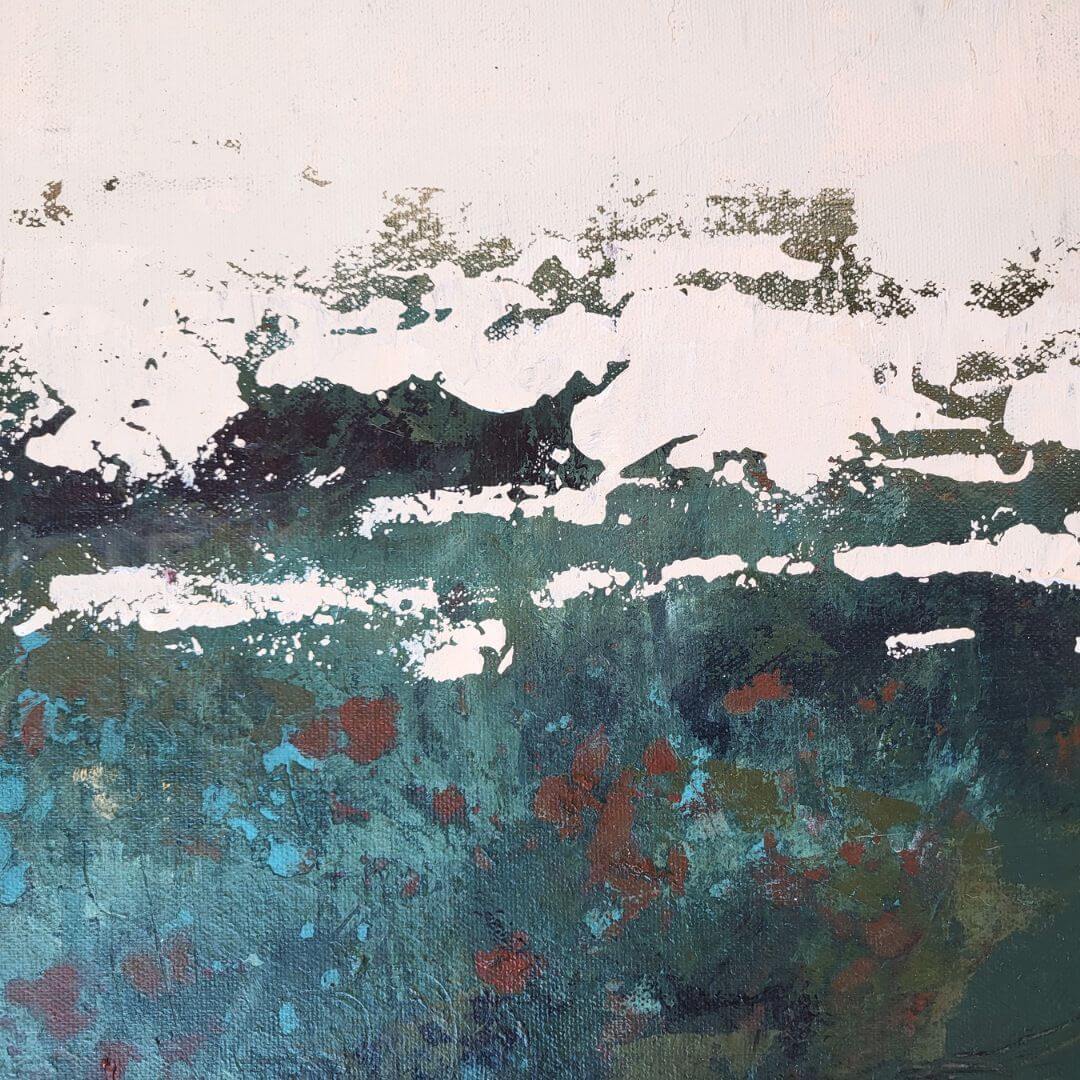 Vihreäsävyinen, rouhea ja kerroksellinen abstrakti teos. Kuin sammalmätäs metsässä, johon voit laskeutua lepäämään ♡