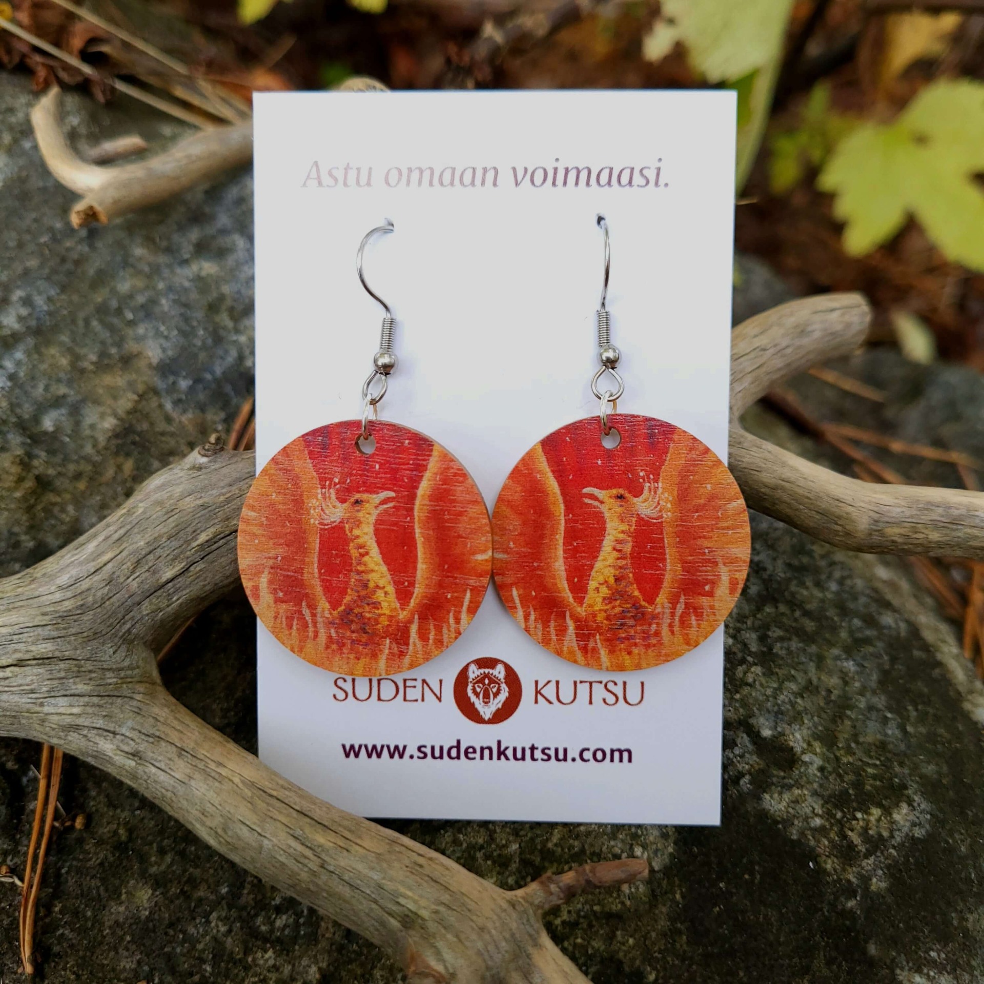Tiina Tolvasen maalauksesta kuvituksensa saaneet korvakorut on valmistettu suomalaisesta PEFC-sertifioidusta koivuvanerista (paksuus 2 mm). Metallirengas hopeoitua korumetallia, koukku kirurginterästä. Vaneriosan halkaisija 3 cm. Kääntöpuoli luonnonväristä vaneria.