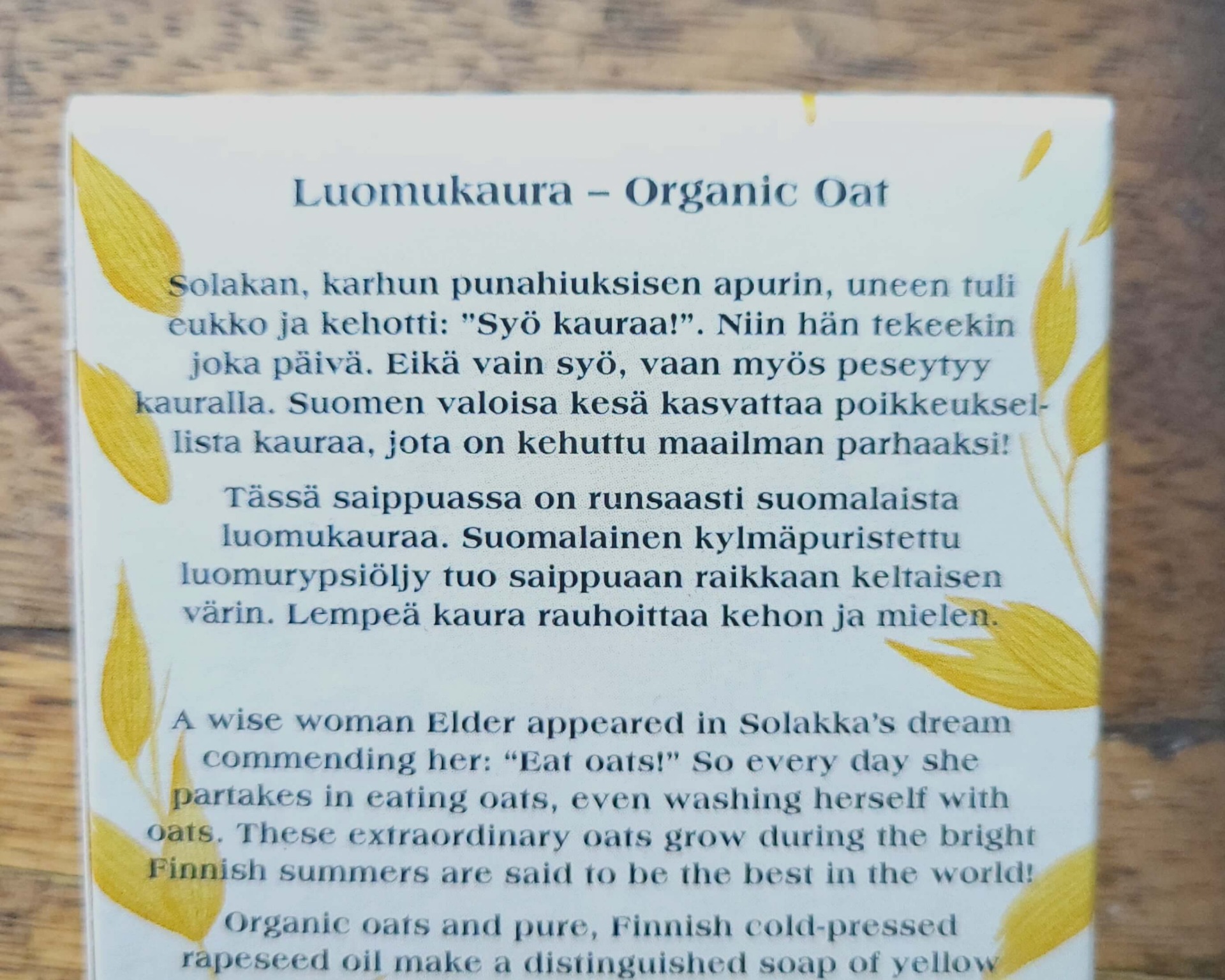 Tuoksuton ja vegaaninen luomusaippua jossa on suomalaista luomuviljeltyä kauraa. Tässä hellästi kuorivassa saippuassa on hurmaavan kermainen vaahto.
