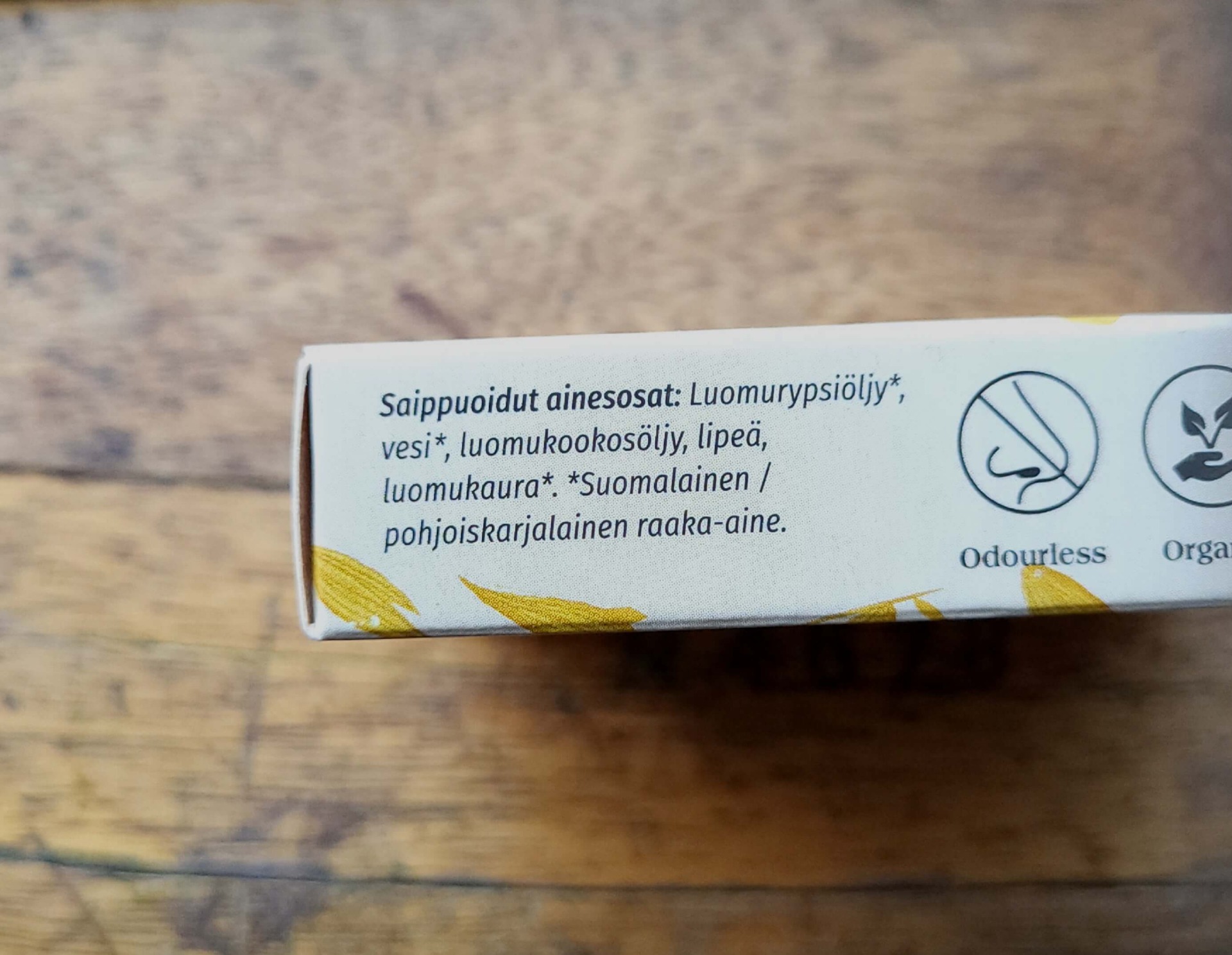 Luomurypsiöljy*, vesi*, luomukookosöljy, lipeä, luomukaura*. *Suomalainen/pohjoiskarjalainen raaka-aine.