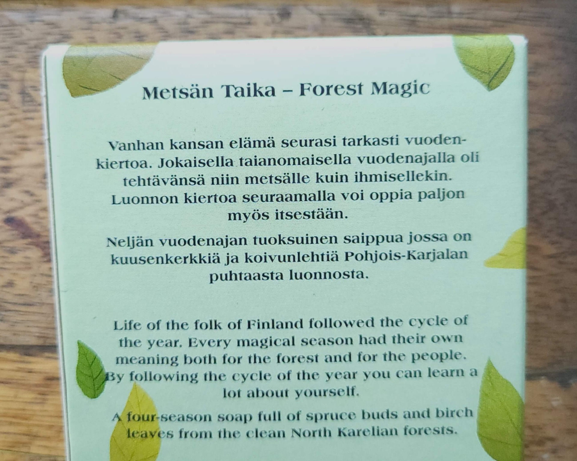 Neljän vuodenajan tuoksuinen vegaaninen luonnonsaippua jossa on kuusenkerkkiä ja koivunlehtiä Pohjois-Karjalan puhtaasta luonnosta. Siperiankuusen, männyn, patsulin ja luomumeiramin eteeriset öljyt siirtävät metsän tuoksut ihollesi.