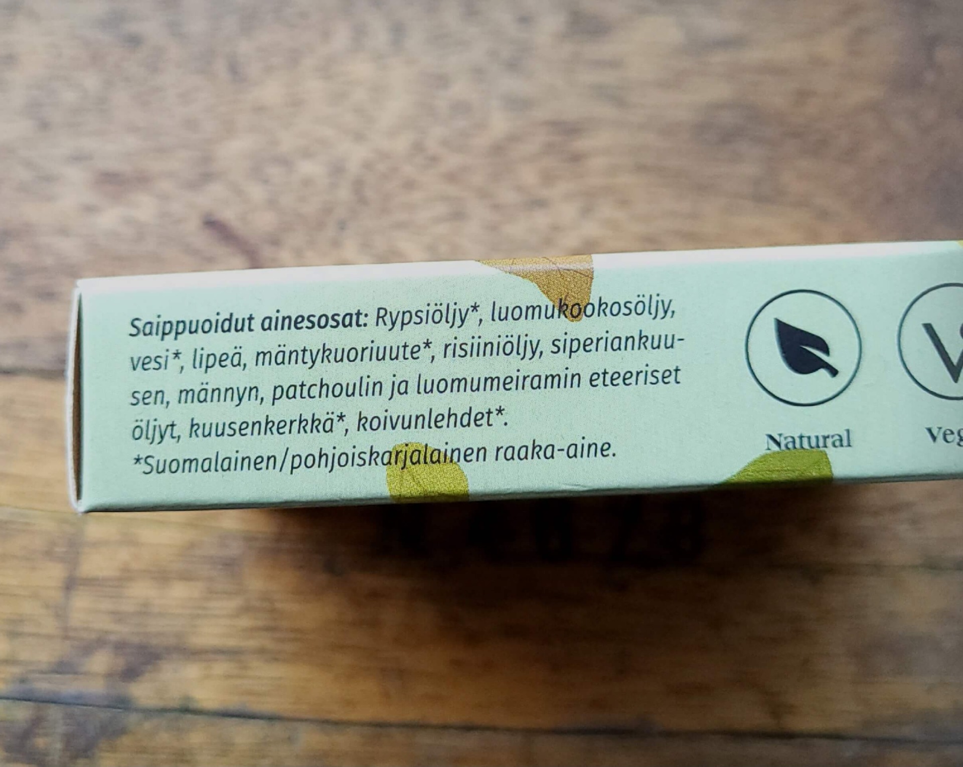 Ainesosat: Rypsiöljy*, luomukookosöljy, vesi*, lipeä, mäntykuoriuute*, risiiniöljy, siperiankuusen, männyn, patchoulin ja luomumeiramin eteeriset öljyt, kuusenkerkkä*, koivunlehdet*. *Suomalainen/pohjoiskarjalainen raaka-aine.