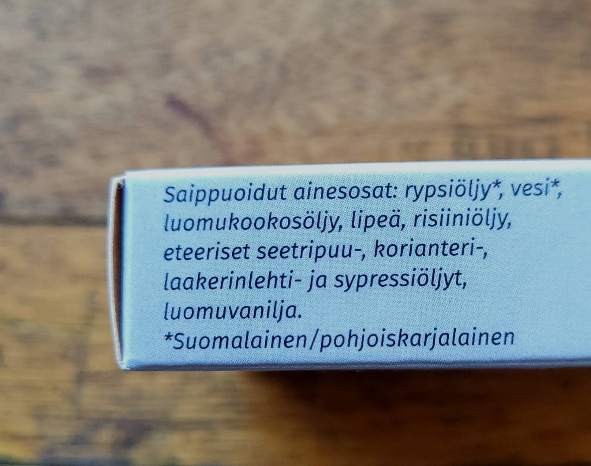Ainesosat: rypsiöljy*, vesi*, luomukookosöljy, lipeä, risiiniöljy, eteeriset seetripuu-, korianteri-, laakerinlehti- ja sypressiöljyt, luomuvanilja. *Suomalainen/pohjoiskarjalainen raaka-aine!