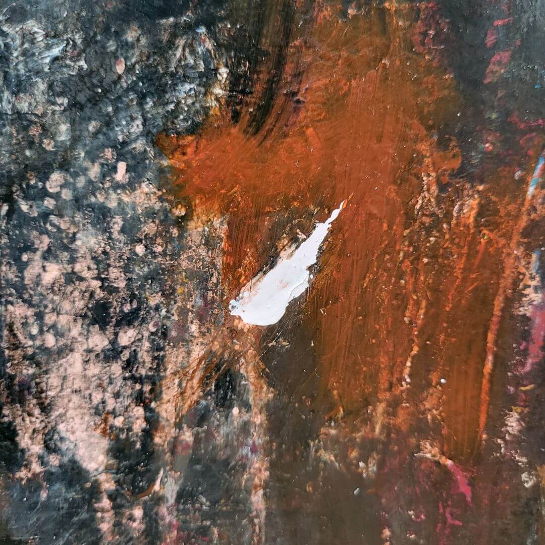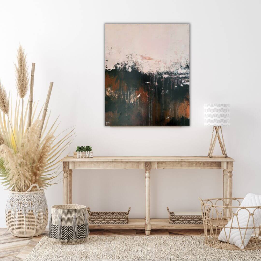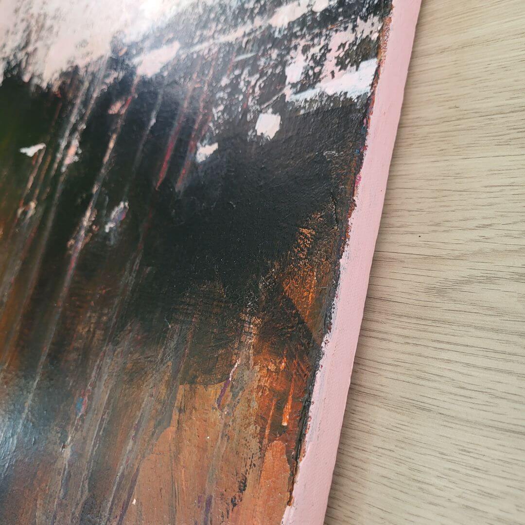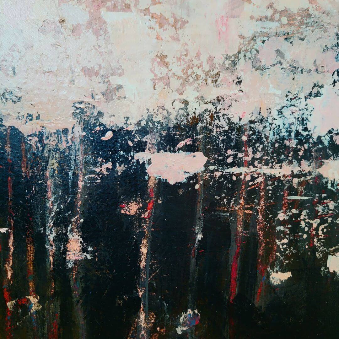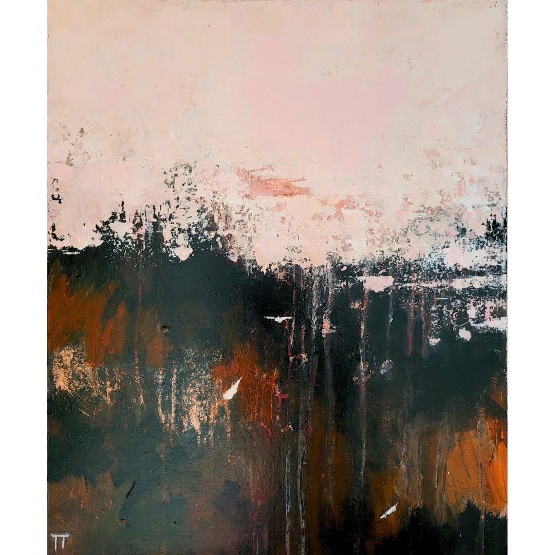 Hempeää roosaa ja vahvoja kontrasteja. Rouhea ja tunnelmallinen abstraktiteod.