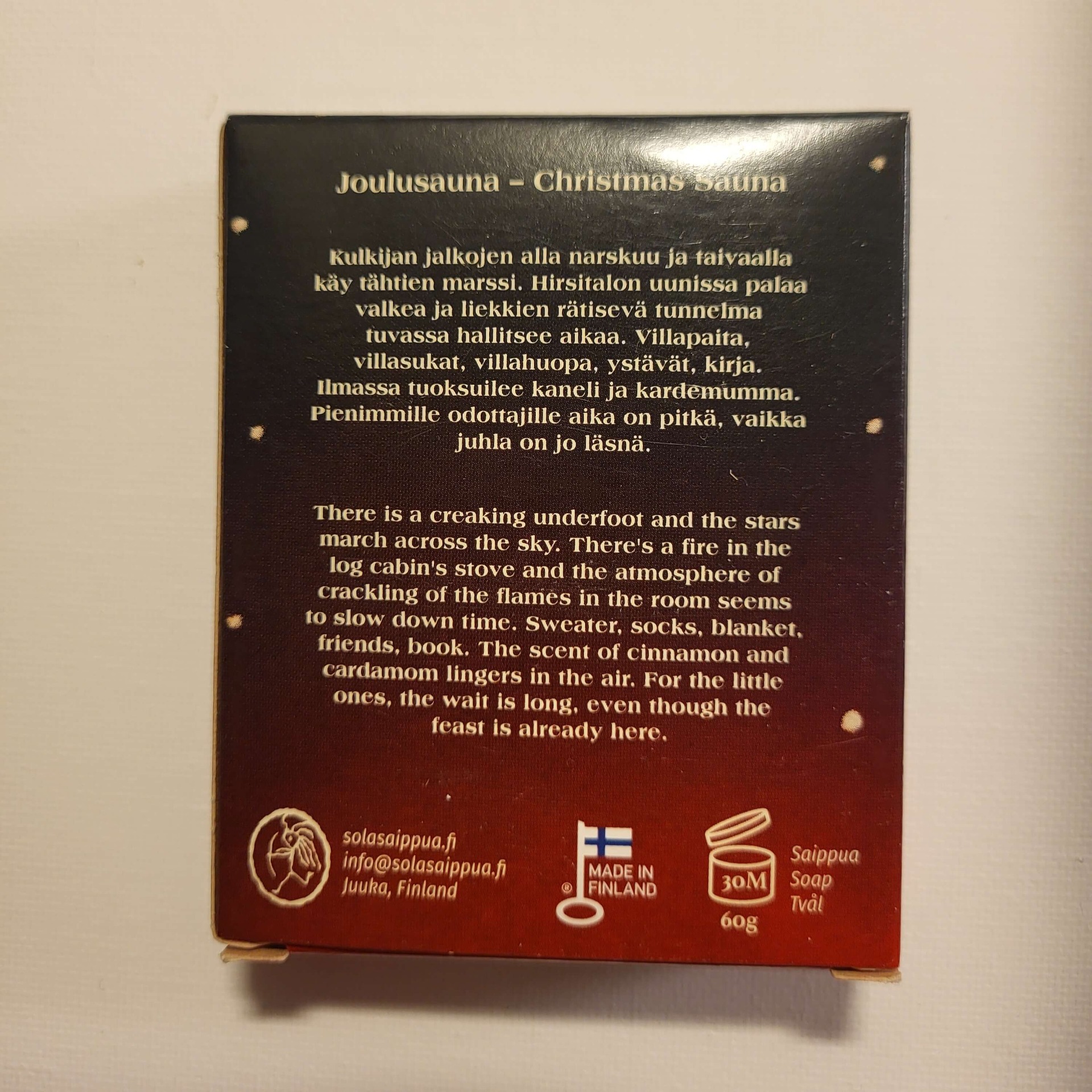 Tuoksu: Ihanan jouluinen tuoksu, lämmin kuin perinteinen glögi. Sisältää kanelin, mausteneilikan, inkiväärin ja appelsiinin eteerisiä öljyjä, vähän kardemumma- ja mustaherukkasiemenjauhetta.