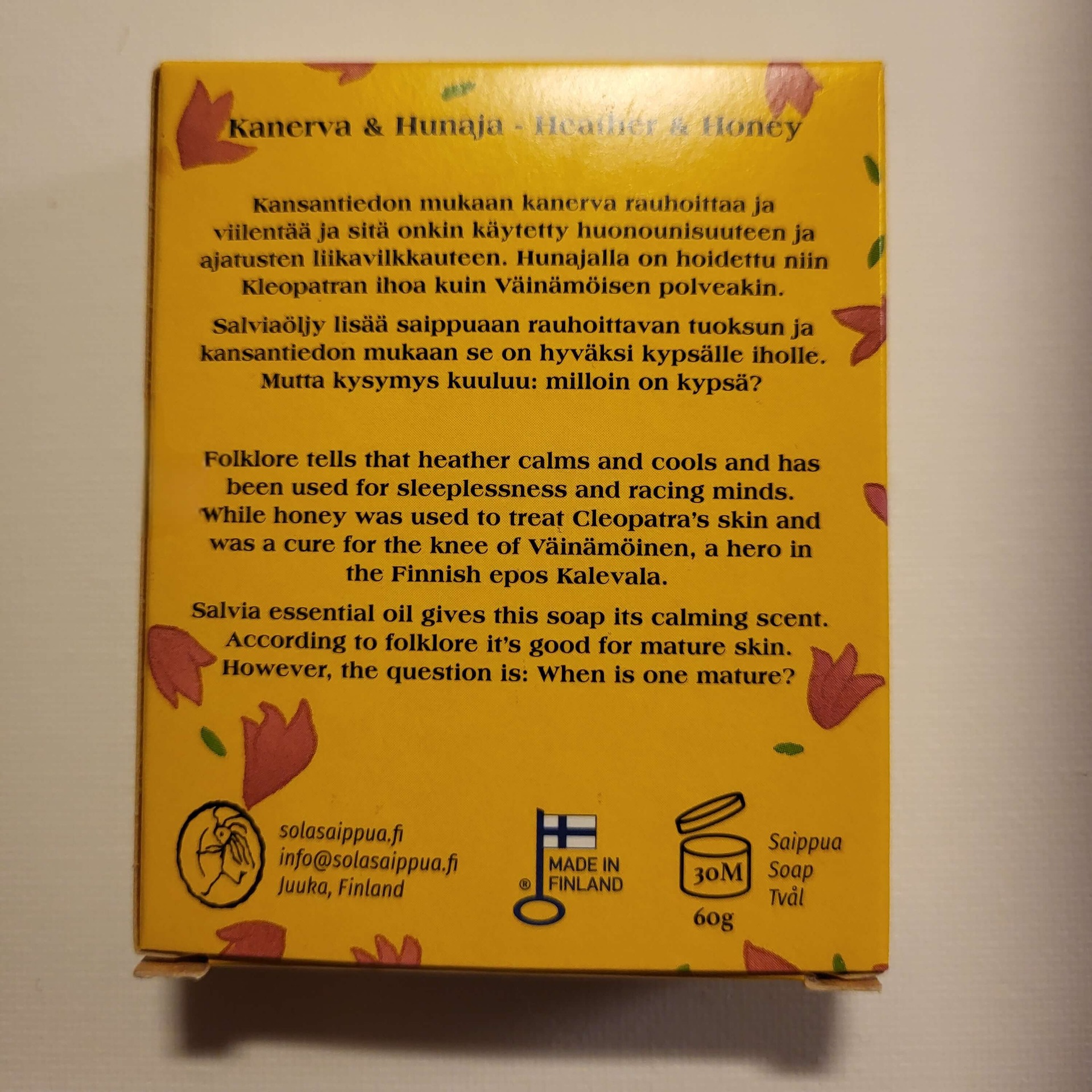 Miedon tuoksuinen luonnonsaippua jossa on käytetty suomalaista luomukauraa, kanervankukkia, paljon hunajaa ja mehiläisvahaa sekä aprikoosinsiemenöljyä. Hajustettu kevyesti muskatellan ja luomuappelsiinin eteerisellä öljyllä. Hyvä kaikille ihotyypeille.