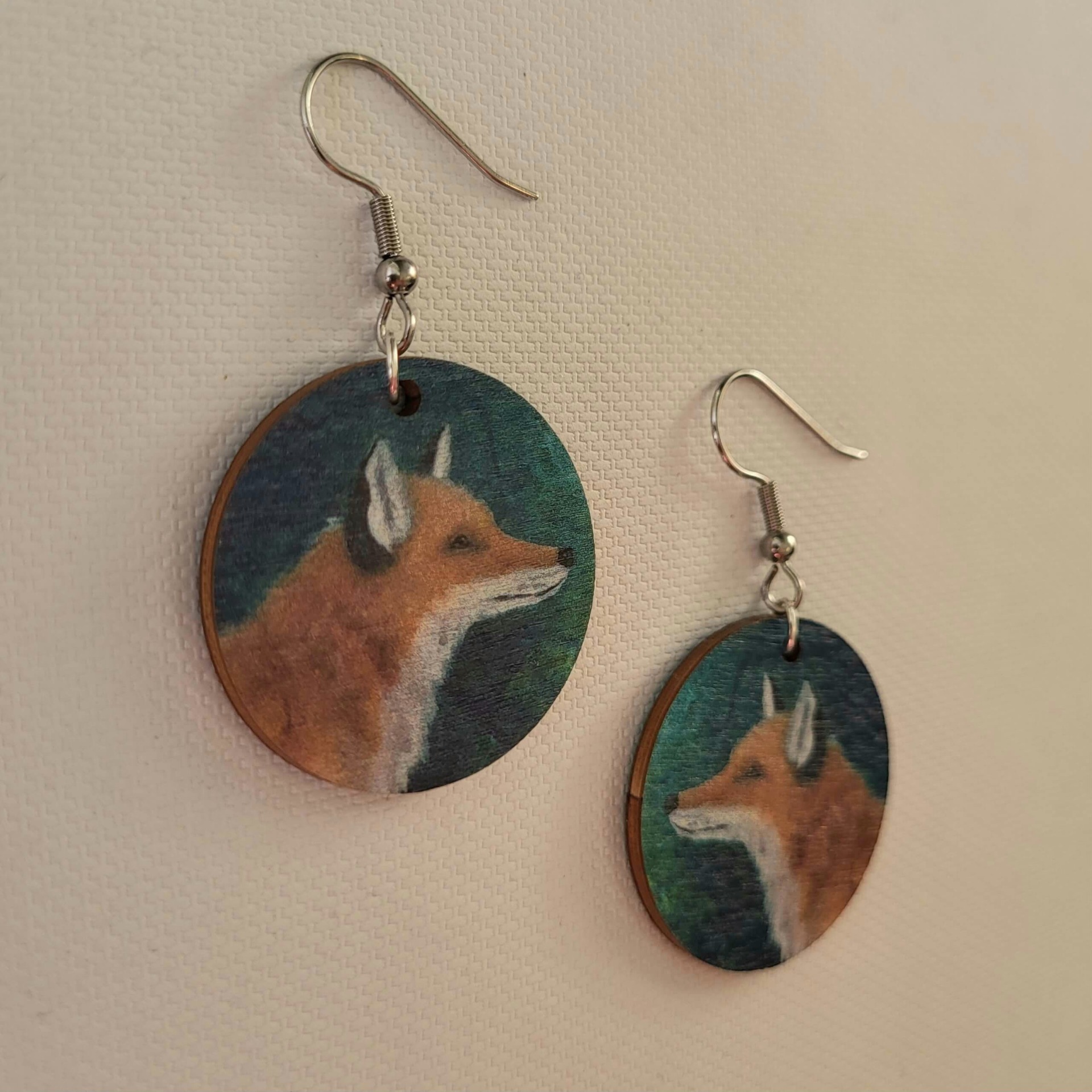 Tiina Tolvasen maalauksesta kuvituksensa saaneet korvakorut on valmistettu suomalaisesta PEFC-sertifioidusta koivuvanerista (paksuus 2 mm). Metallirengas hopeoitua korumetallia, koukku kirurginterästä. Vaneriosan halkaisija 3 cm. Kuva molemmin puolin.