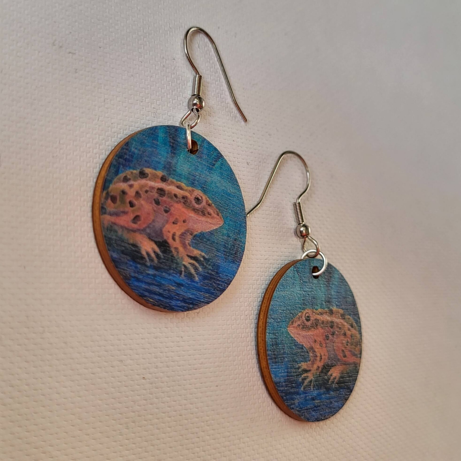 Tiina Tolvasen maalauksesta kuvituksensa saaneet korvakorut on valmistettu suomalaisesta PEFC-sertifioidusta koivuvanerista (paksuus 2 mm). Metallirengas hopeoitua korumetallia, koukku kirurginterästä. Vaneriosan halkaisija 3 cm. Kuva molemmin puolin.