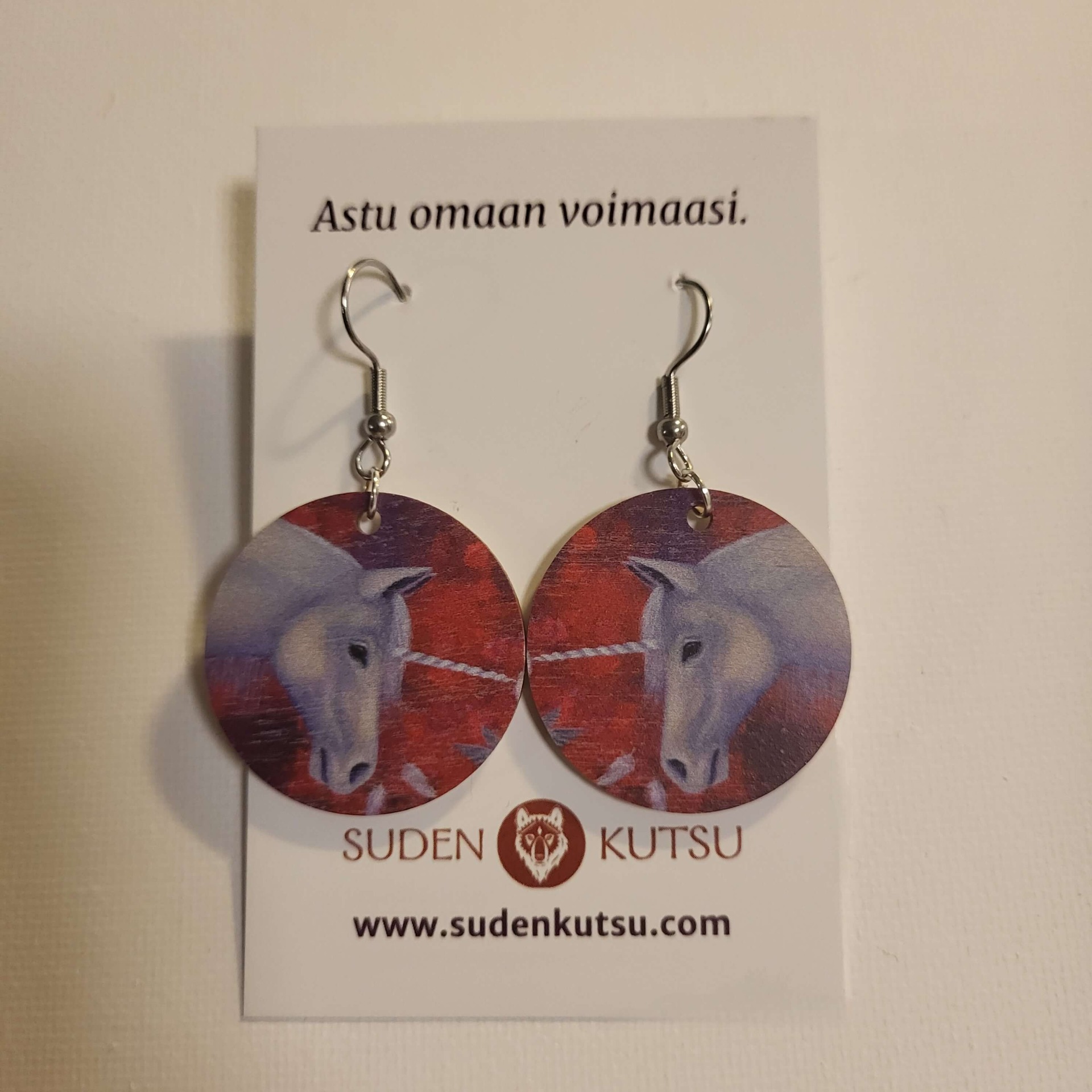 Tiina Tolvasen maalauksesta kuvituksensa saaneet korvakorut on valmistettu suomalaisesta PEFC-sertifioidusta koivuvanerista (paksuus 2 mm). Metallirengas hopeoitua korumetallia, koukku kirurginterästä. Vaneriosan halkaisija 3 cm. Kääntöpuoli luonnonväristä vaneria.