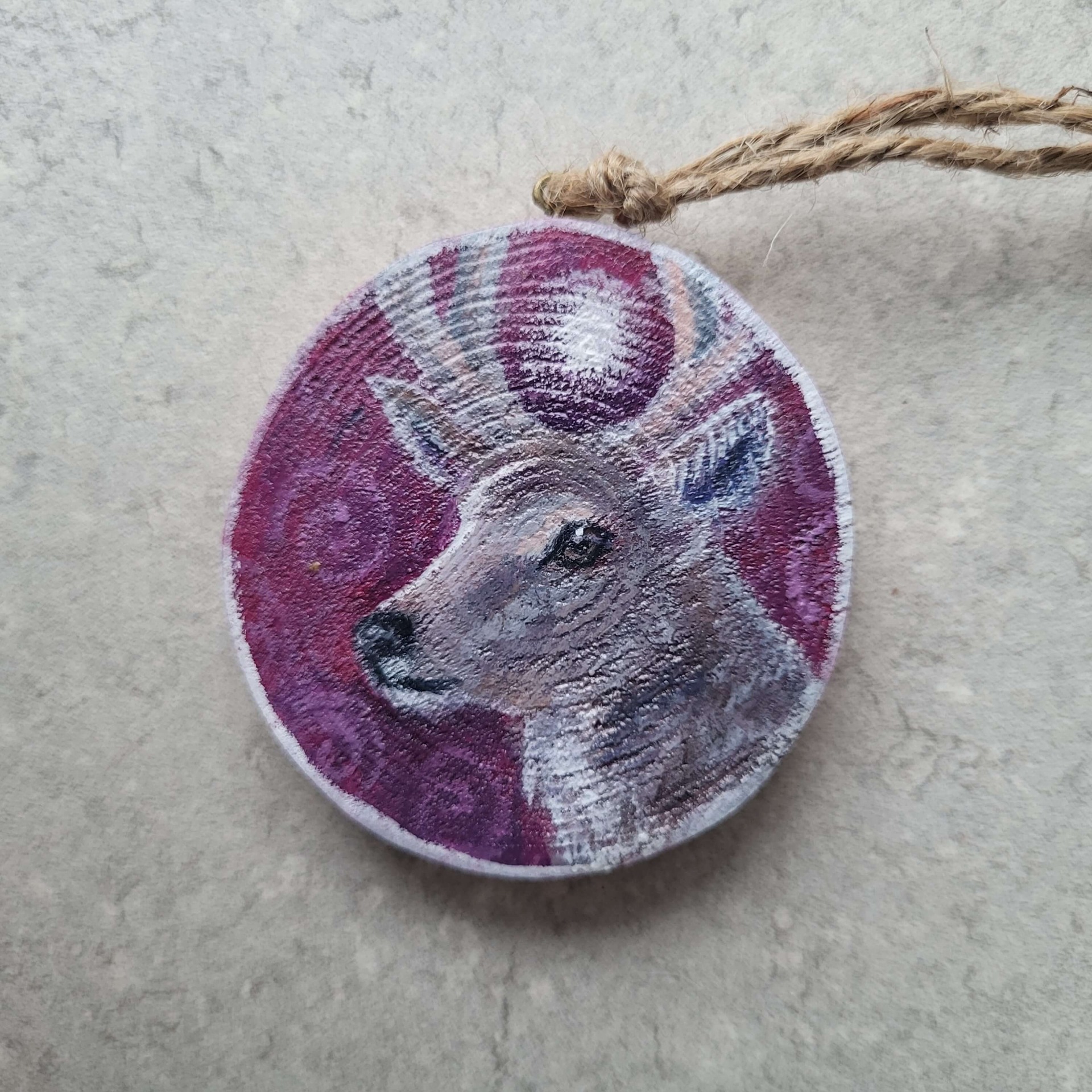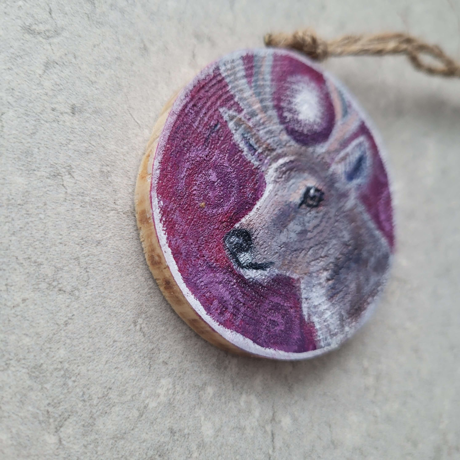 Kokonaisuudessaan käsin tehty ja maalattu uniikki puinen voimaeläin-amuletti, halkaisija noin 5 cm. Materiaaleina mänty tai kuusi, metallinen ripustus-silmukka ja juuttilanka.