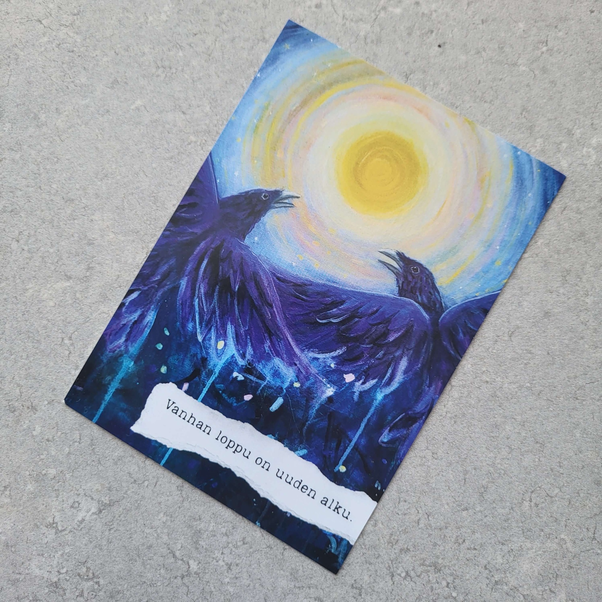 Alkuperäinen teos ja design: Tiina Tolvanen, Suden Kutsu. Suomessa painettu, kääntöpuolella osoiteviivasto.